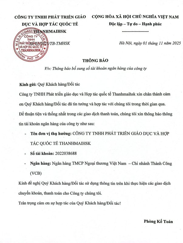 - Ngân hàng: Ngân hàng TMCP Ngoại thương Việt Nam – Chi nhánh Thành Công (VCB)