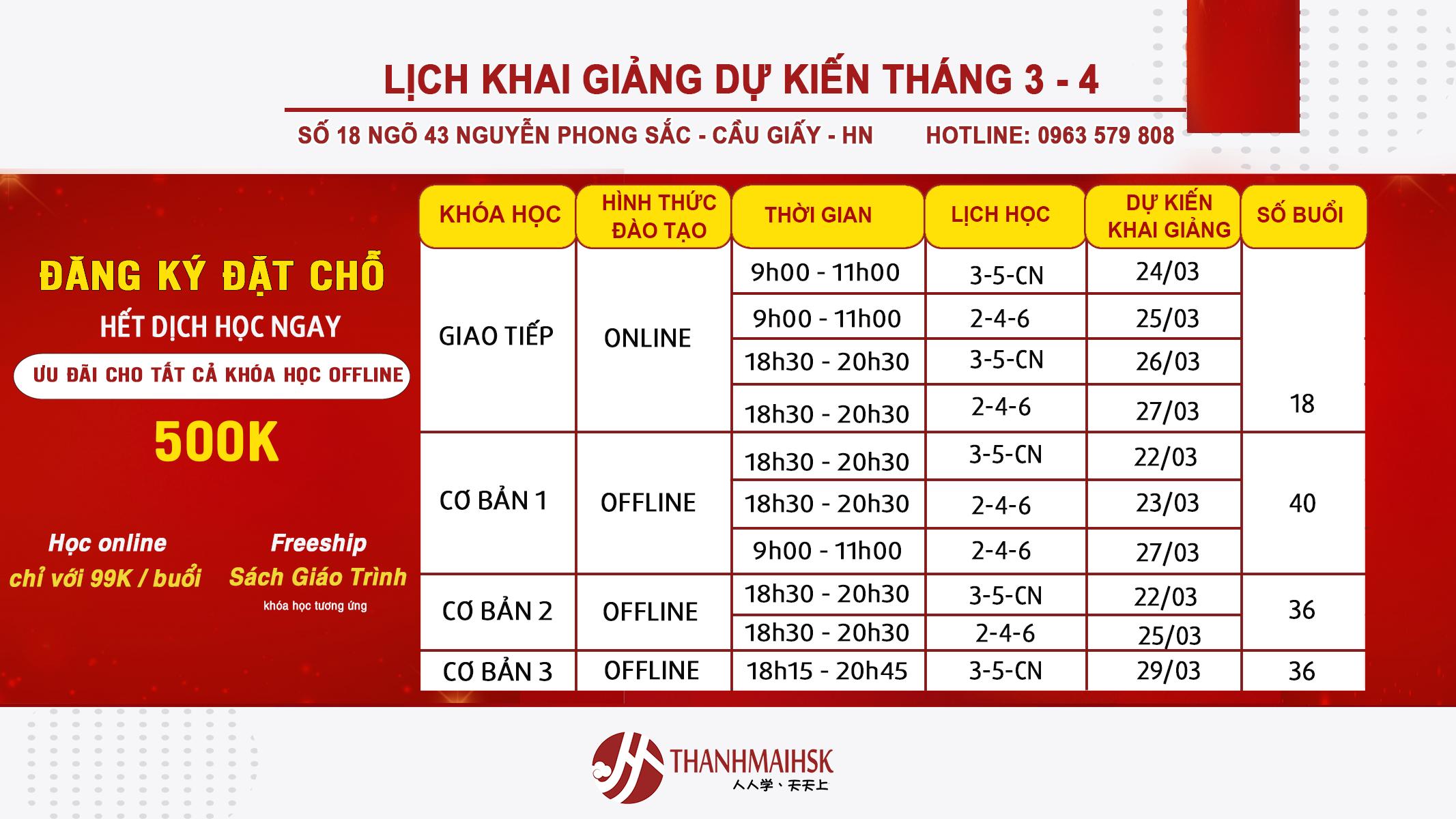 Lịch khai giảng tháng 3 các cơ sở Cầu Giấy