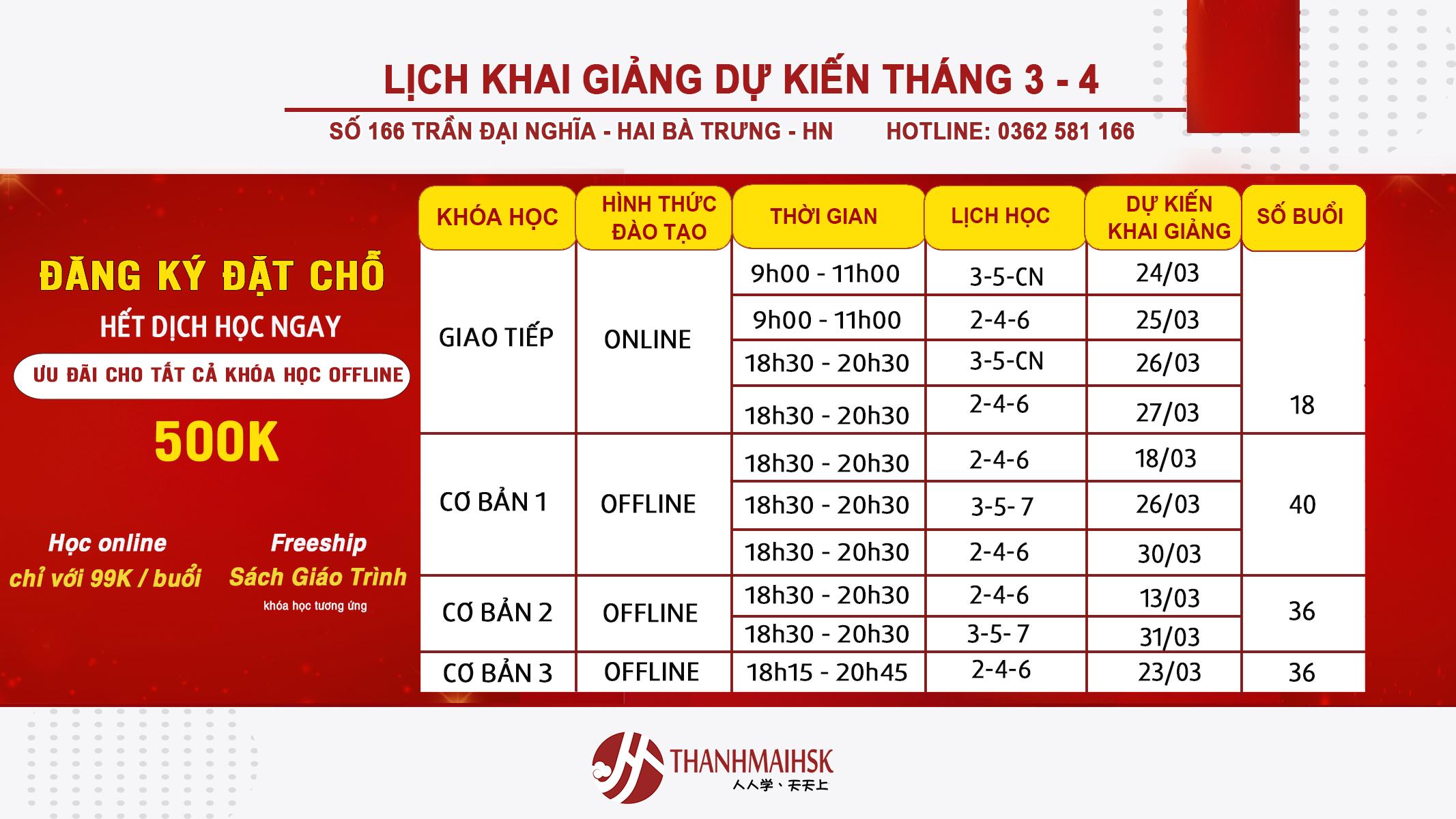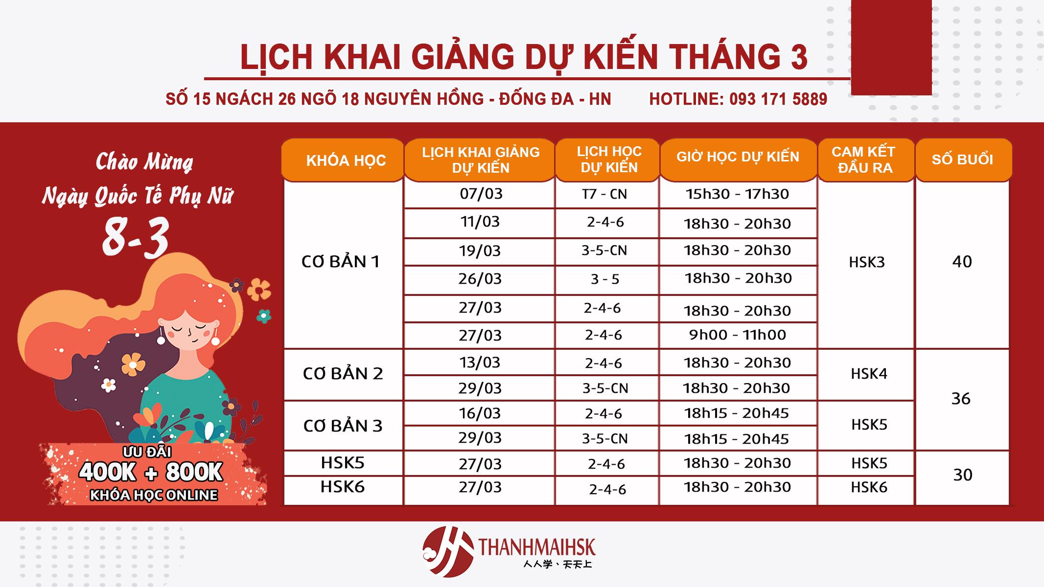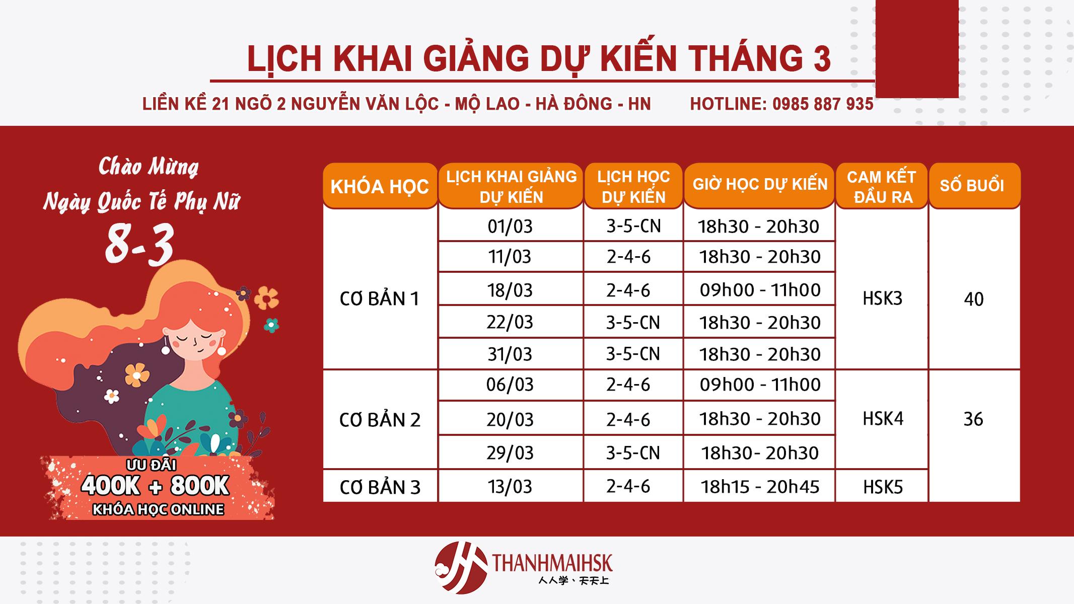 Lịch khai giảng tháng 3 các cơ sở Hà Đông